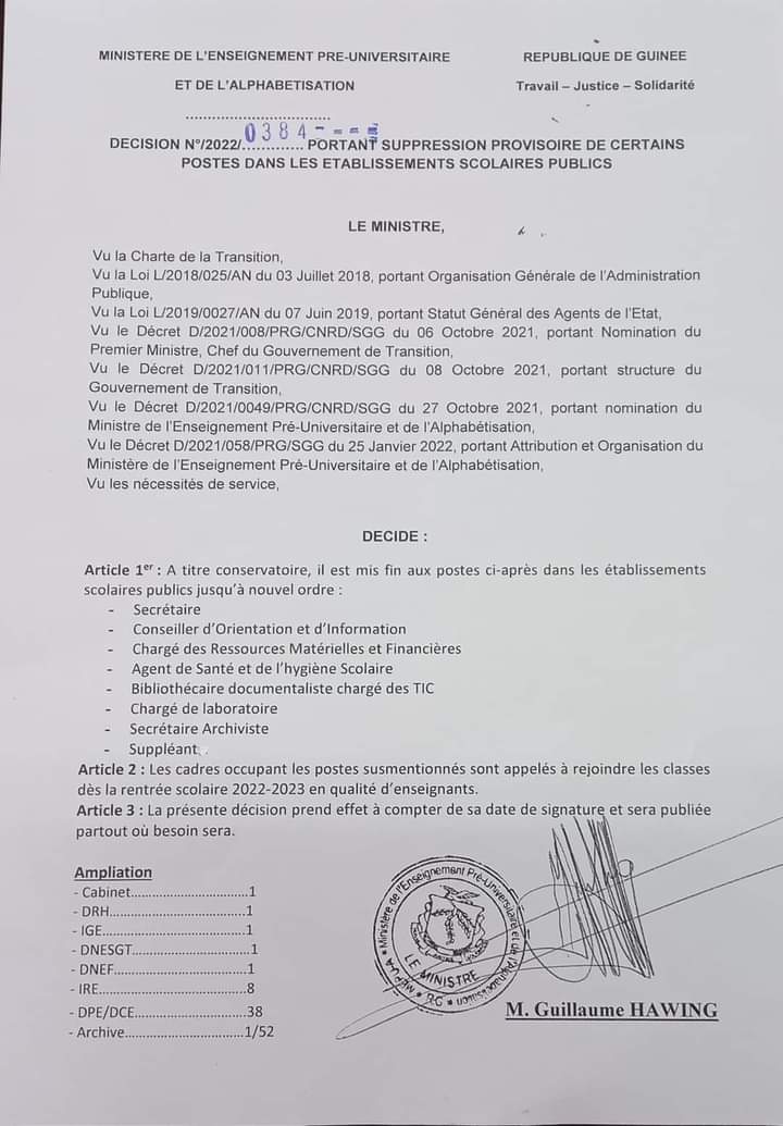 La décision du ministre de l'enseignement pré-universitaire et de l'alphabétisation portant suppression provisoire de ces postes pour des nécessités de service, ne donne pas de détails. Tout porte à croire quand même que c'est pour résoudre la crise d'enseignant dans les écoles publiques du pays, particulièrement dans les zones rurales.