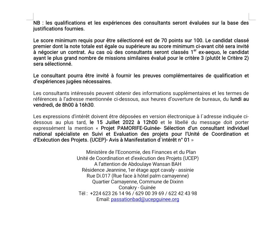 Guinée : Avis de recrutement d'un Consultant Individuel National Spécialiste en Suivi Evaluation des projets pour l’UCEP