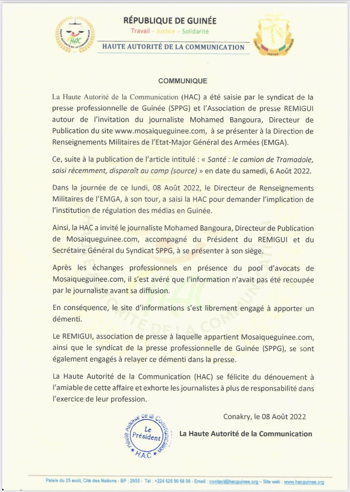 Sous l'égide la Haute Autorité de la Communication (HAC), le journaliste Mohamed Bangoura, directeur des publications du site mosaiqueguinee.com et le Renseignement militaire ont trouvé ce lundi 8 août 2022, un règlement à l'amiable du différend qui les oppose. Le journaliste s'est engagé à apporté un démenti à sa publication portant sur la disparition d'un camion de médicaments impropres à la consommation dans un camp militaire de Conakry.