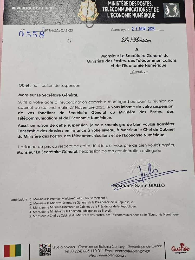 « Suite à votre acte d’insubordination commis à mon égard pendant la réunion de cabinet de ce lundi matin 27 novembre 2023, je vous informe de votre suspension de vos fonctions de Secrétaire Général du Ministère des Postes, des Télécommunications et de l’Economie Numérique. » Et sans donner les raisons et la nature de cette insubordination, Monsieur le Ministre d’enchaine : « En raison de cette suspension, je vous serais gré de bien vouloir transférer l’ensemble des dossiers en instance à votre niveau, à Monsieur le Chef de Cabinet du Ministère des Postes, des Télécommunications et de l’Economie Numérique. J’attache du prix au respect de cette décision, et vous prie de bien, vouloir l’agréer. »