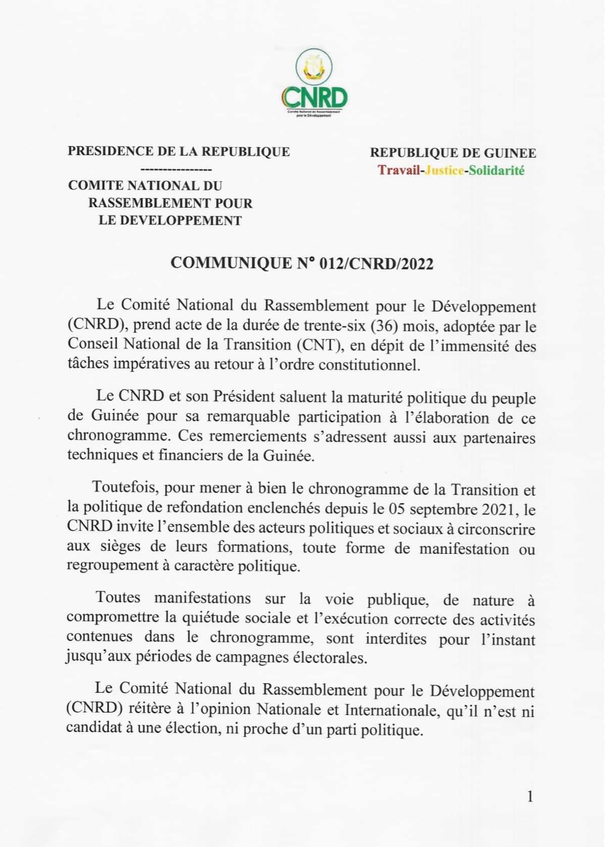 Transition en Guinée : le CNRD prend acte des 36 mois et interdit toutes manifestations. ..